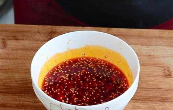 4、将两勺辣椒酱和一勺白芝麻放入红辣椒碗中,锅内倒入足量的油,加入花椒、大料炒出香味,然后将热油倒入辣椒碗中,加入一茶匙盐、味精和糖,再加入生抽、香醋和少许香油拌匀。