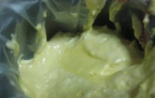 5、加入低筋面粉,从底部捞起翻拌的方法将面粉和蛋液混合好,这个过程速度要快。将混合好的面糊倒入裱花袋,再将裱花袋头剪个小圆口。