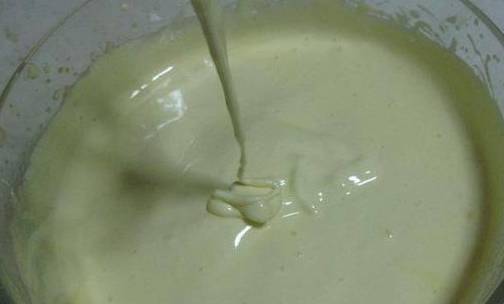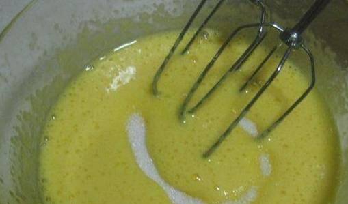 2、先打蛋,然后加入三分之一的糖,继续打,变粘稠再加一半糖。