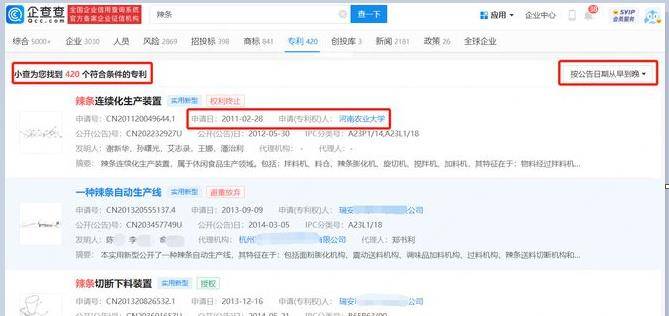 据企查查APP显示,目前国内与麻辣烫相关的专利有400多项,其中最早申请的是河南农业大学的“麻辣烫连续生产装置”,申请时间为2011年2月。