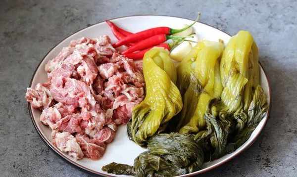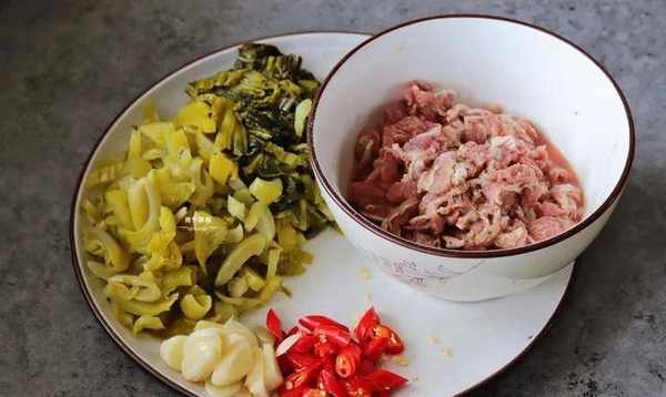 1、从市场上买来的酸菜,要先泡水洗净,去除酸菜中多余的盐份,然后将酸菜切丁;蒜片;将辣小米切成辣椒圈;会切牛肉的可以自己切不会切的也可以请菜场老板帮忙切牛肉带回家洗干净装碗里供以后使用。