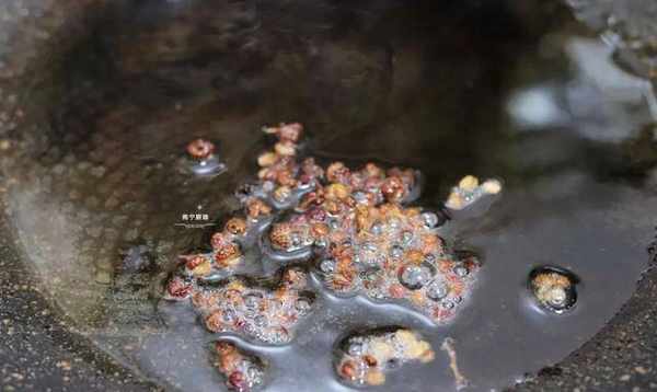 3、热锅倒入油,加入一勺花椒,待花椒爆香后,用滤网捞出。