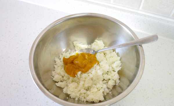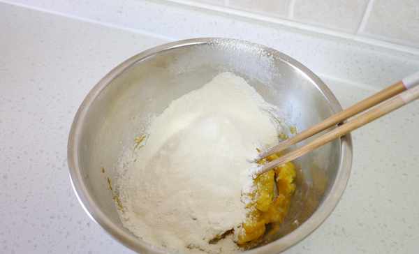 9.我们先在土豆泥中加入南瓜泥。