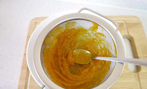 6.南瓜烤软后取出,用小滤网过滤一遍。