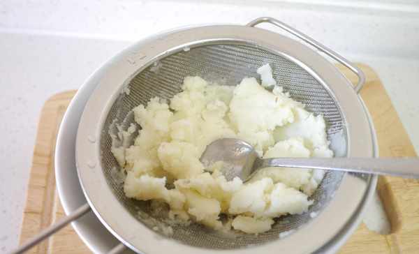 7.土豆煮熟后取出,趁热去皮,同样用小滤网过滤一遍,过滤是为了口感更好,觉得麻烦可以直接压成土豆泥。