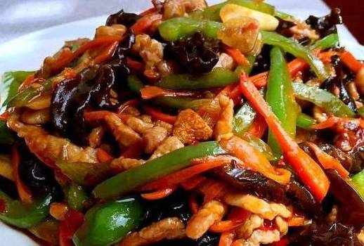 5.锅中留的底油烧热,倒入葱姜、香辣酱爆香,倒入胡萝卜丝、青红椒丝、木耳丝炒出香味,再把肉丝回锅,加适量水烧至食材融合,倒入糖醋汁,用水淀粉勾芡出锅即可.