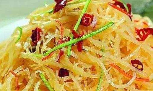 2.土豆开水浸泡,泡去表面的淀粉,使土豆丝更脆,不容易糊锅。这就是酸辣土豆丝的诀窍之一.