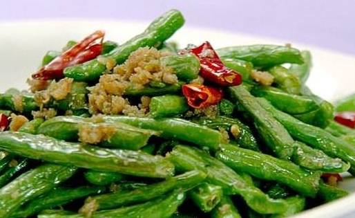 5、放入炸好的四季豆,加盐快速炒15至20秒,完成。