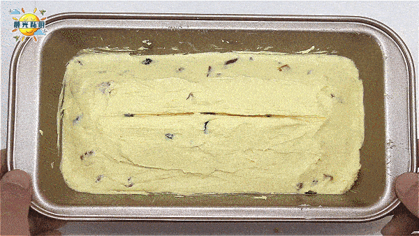 再用刮刀在顶部的中间位置划一条出来,这样可以帮助蛋糕在烘烤时开口。
