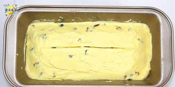 在腌渍果干的同时,在烤模内壁刷上一层软化的黄油,防止烘焙后沾粘。