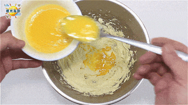 然后将打散的鸡蛋液分2次,加入打发好的无盐黄油中。