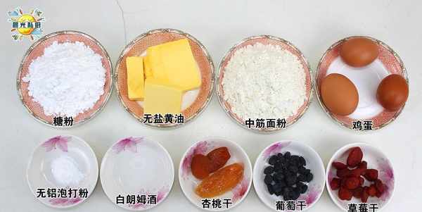 可以随自己的喜好,或是手头有什么样的果干都可以用来制作这款水果蛋糕。