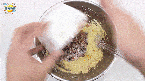 接下来,将裹上干粉的果干倒入面糊中,并充分混合均匀。