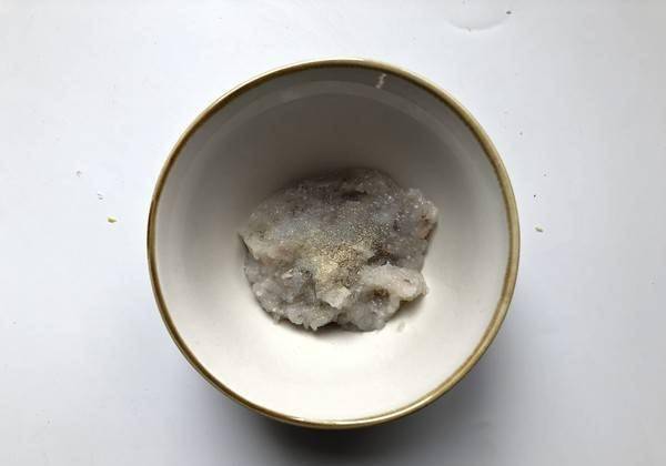 6.将虾仁泥平铺在香菇上,表面均匀地撒少许食盐
