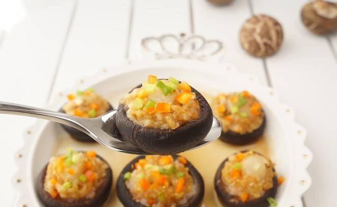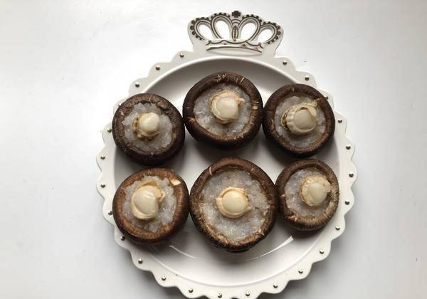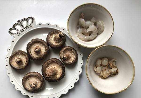 鲜香菇 6朵、虾仁 100克、裙边贝 6个、蒜 1头、生抽 2克、白胡椒粉 1克、精盐 适量