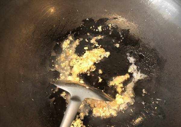 8.小火将蒜泥炒至微微变色,加入生抽,少许食盐,全部炒匀后关火