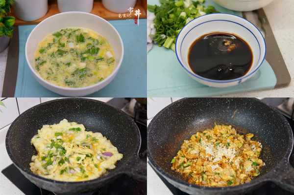 4、起锅烧油,油热后倒入槐花鸭蛋混合液,等待一面定型后翻面,翻炒至结块熟透。