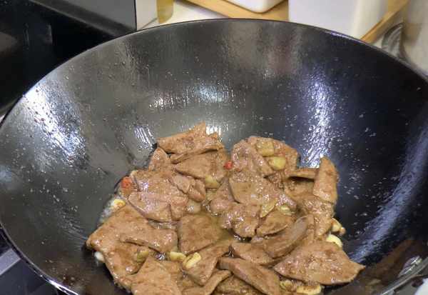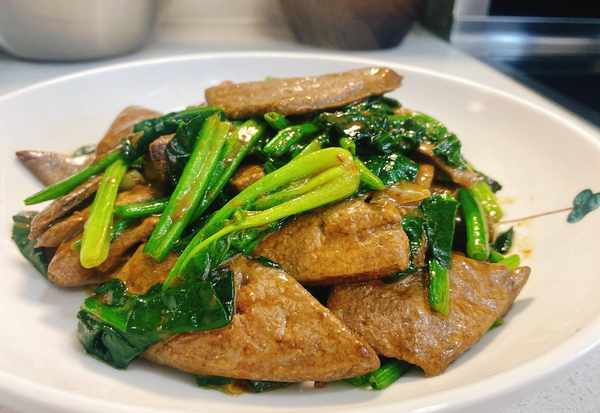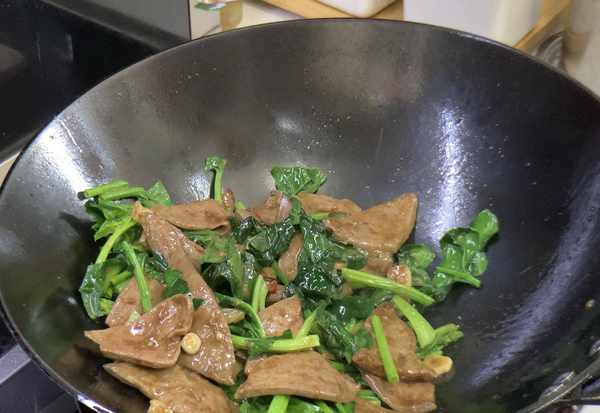 食材:猪肝、菠菜、蒜片、盐、料酒、生抽、淀粉、食用油。