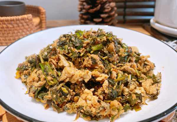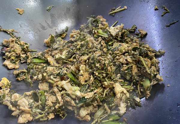步骤3:接着加入香椿翻炒均匀,加些盐调味,倒入鸡蛋液,加热至凝固,再翻炒松散开,就可以出锅了。
