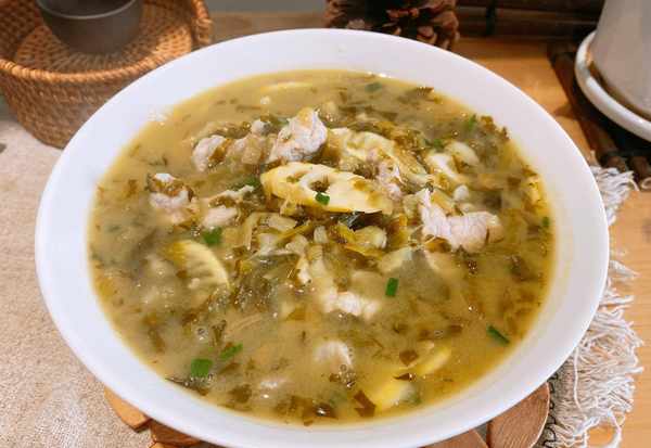 步骤4:加少许水烧煮片刻,加入猪肉片煮熟,加盐和鸡精调味,撒些葱花就可以出锅了。