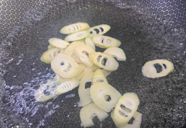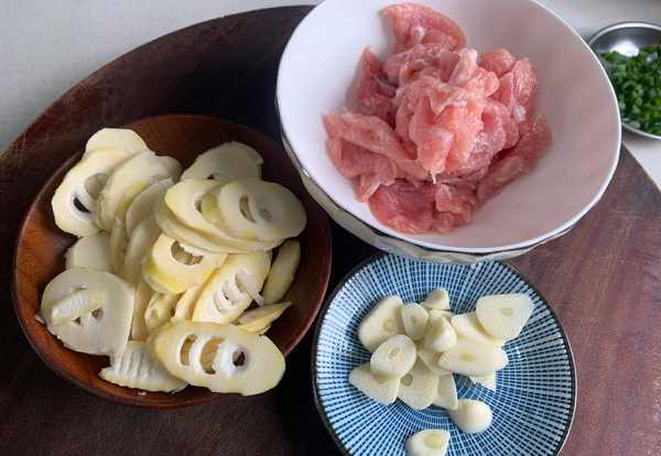 步骤1:春笋处理干净切片,然后浸泡水里备用。切点猪肉和蒜片备用。