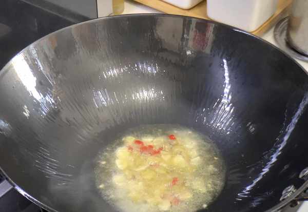 步骤2:起锅烧油,加蒜片、姜片、泡椒和辣椒煸香。