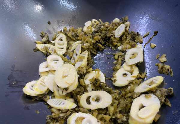 步骤3:起锅烧油,加葱蒜和雪菜翻炒片刻,把雪菜水分炒干炒透,再加春笋一起翻炒。