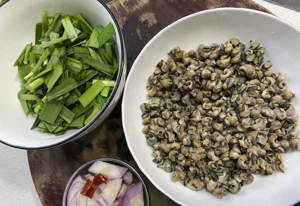 步骤1:螺肉清洗干净,韭菜洗干净切段备用,再切点蒜末和辣椒。