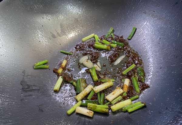 步骤2:起锅烧油,锅中加1勺豆瓣酱略炒片刻,然后倒入小葱段翻炒片刻。