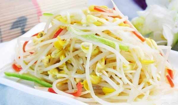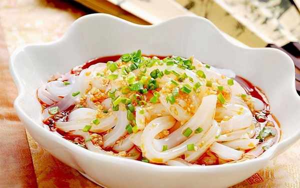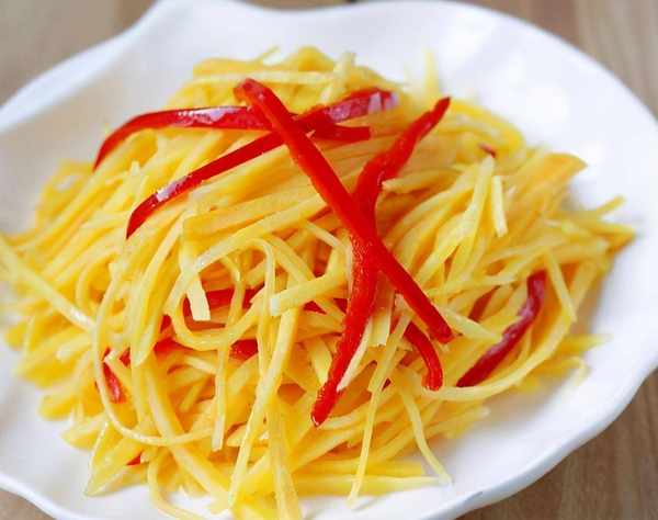 3、热锅凉油,加红薯丝大火翻炒,加醋翻炒均匀,加盐炒均匀,加红辣椒、鸡精翻炒均匀即可。