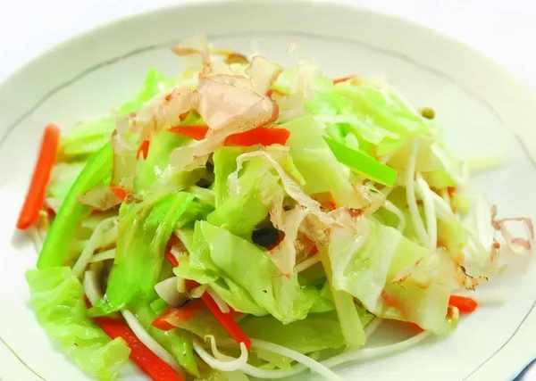 4.起锅烧油,小火爆香干红椒和姜末、倒入白菜、二分之一白醋、糖、大火翻炒均匀、放鸡精、盐、剩下的白醋、炒匀即可。