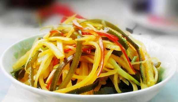 1. 红椒切丝,土豆洗净去皮后切成丝,放入沸水锅中焯熟,干海带丝用水泡开洗净,放入沸水锅中焯熟。