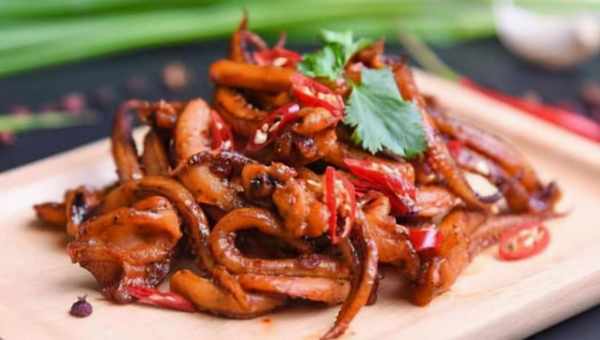 1.、鱿鱼须清洗干净切成小块,放入盘里待用。干辣椒洗净剪成小段,生姜去皮洗净切片,蒜去皮洗净待用。