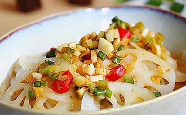 7、在藕片上撒上蒜末、香葱末和剪好的红椒段,然后起锅烧热适量油至冒烟,浇在藕片上即可。