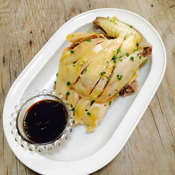 2.锅内放入清水烧开,隔水蒸二十分钟,待鸡放凉后再斩件上碟,用碟内剩下的鸡汁,倒适量到另一小碗内,加入1/3的鸡粉拌匀,最后再加少许香麻油即可。
