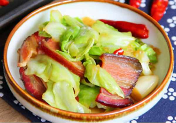 食材:卷心菜1小棵、腊肉1块、干辣椒5根、蒜5瓣、食盐1小勺、白糖1小勺、蒸鱼豉油5毫升
