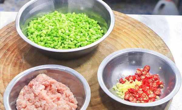1.准备蒜台一把,清洗干净,把头摘掉切成小粒。猪肉200克,先切成薄片再剁成肉末。切点姜末、小米椒圈备用。