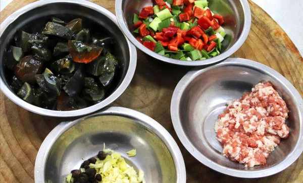 1.准备4个皮蛋,放入锅中蒸制5分钟去壳。五花肉一小块,剁成肉沫备用。生姜、大蒜切末,放入盆中再抓入豆豉5克备用。蒜苗切成小段放入盆中,红椒一小段切成红椒粒。