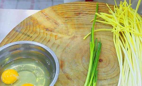 1.准备鸡蛋三个,小葱几根,小葱切成碎沫,和鸡蛋放在一起,勾入一点水淀粉,加一点明油搅拌均匀。蒜黄切成三厘米左右的段,放在盆里。
