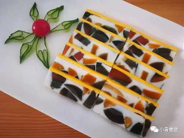 2. 坐锅点火,加入适量清水烧开,先在模具中倒入适量蛋清液,再放入蒸锅蒸约2分钟取出,然后在中间摆入咸蛋黄,两边放入松花蛋,再倒入鸡蛋液,入锅继续蒸2分钟,取出凉冷,切成薄片,装盘上桌即可。