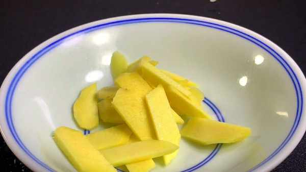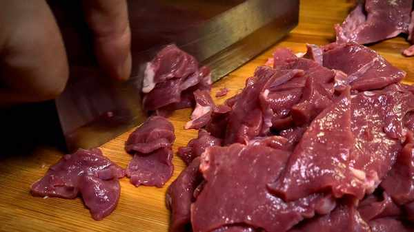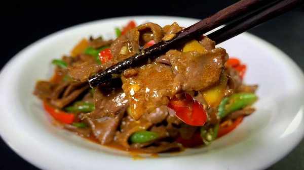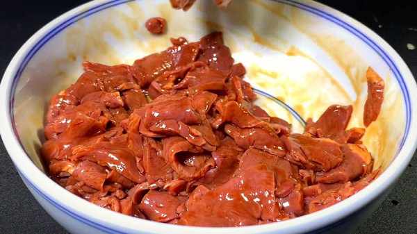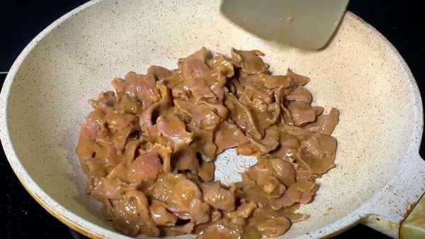 5.锅内加入少许食用油,油热后下入猪心,大火快速翻炒,将猪心炒至变色,盛出装入碗中备用。
