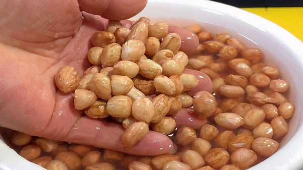 1.将花生倒入大碗中,挑出坏掉的花生,再倒入适量的清水,浸泡两个小时,泡好后捞出控干水分备用。