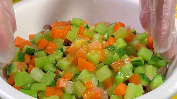 2.胡萝卜去皮切成小丁,西芹改刀切成丁,黄瓜也切成小丁,大葱斜切成片、姜也切片,全部切好后装入碗中备用。