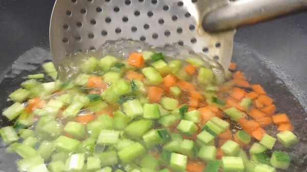 6.锅内留少许底油,倒入适量的清水,再加入半勺食盐,水开后,下入胡萝卜、芹菜丁,焯水1分钟左右,捞出放入凉水中。