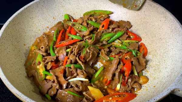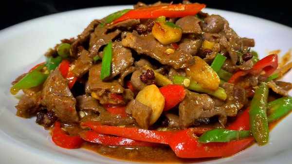 7.将青红椒炒至断生,下入猪心,转大火快速的翻炒,最后加入葱段,快速翻炒几下,将葱段炒至段生,炒出锅气,收干的汤汁就可以了出锅了。