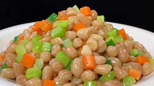7.胡萝卜和芹菜丁过凉后,控干水分倒入花生中,再加入少许食盐、一勺鸡精、一勺白糖、一勺炸好的料酒,最后加入少许芝麻香油,用手抓拌均匀,就可以食用了。