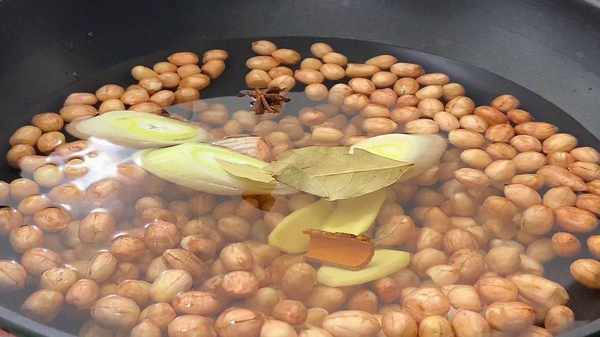 4.锅内倒入适量的水,再加入泡好的花生,加入一小部分的葱姜、八角、桂皮、香叶,适量的食盐,大火烧开,水开后转中火。煮十分钟。