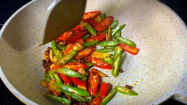 6.锅内再次倒入少许食用油,油热后加入一小把花椒,炒香后加入姜蒜,炒出香味后,再加入一勺豆瓣酱和青红椒,继续翻炒均匀。