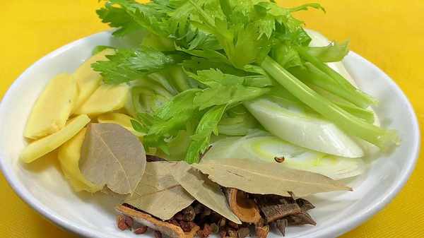 3.大葱斜切成片、姜也切片,切好后装入盘中,再加入芹菜叶子、再准备两颗八角、三片桂皮、一小把花椒、三片香叶。