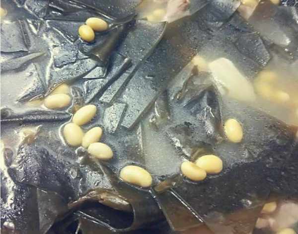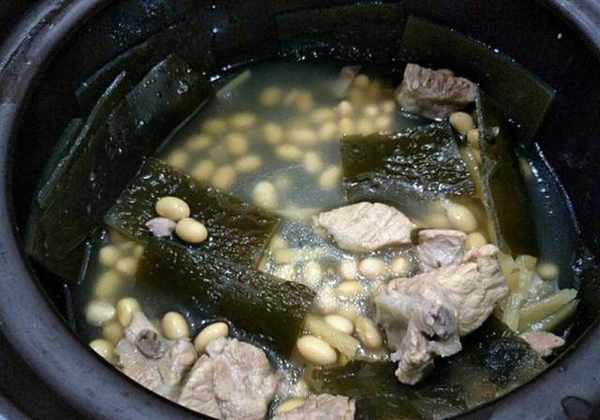 第七步:转小火继续熬制60分钟,等待排骨汤的色泽变黄,黄豆都煮烂了,放入一些海带块,继续炖半个小时,中途揭开锅盖搅动一下。
